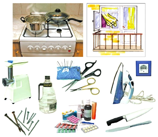 Рассмотри фотографии и рисунок. Подумай и объясни, чем могут быть опасны изображённые предметы. Как нужно с ними обращаться?