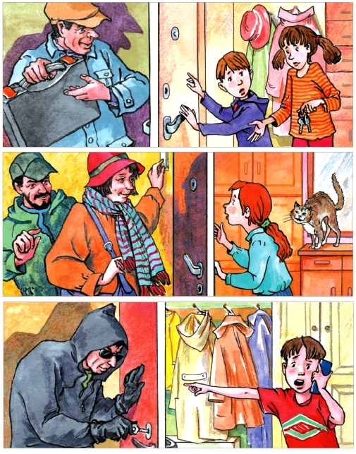 На этих рисунках показано, как незнакомцы пытаются проникнуть в квартиру, просят открыть дверь, представляясь сантехниками, подбирают ключи.