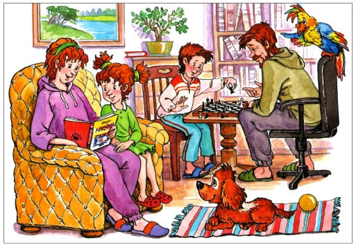 Семья Нади и Сережи состоит из четырех человек. Это дети Сережа и Надя, и их родители — папа и мама. У них в семье живут собака и попугай. Они часто проводят время вместе, читают книги, играют в игры.