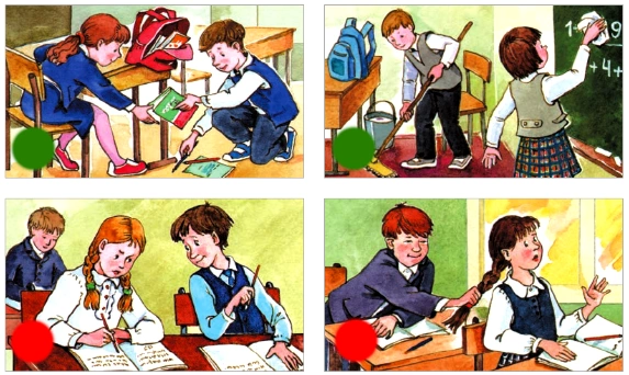 1. Эти рисунки Серёжа приготовил для школьной газеты «Хорошо или плохо?». Накройте зелёными фишками то, что, по-вашему, хорошо, а красными — то, что плохо. Объясните своё решение.