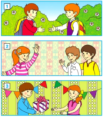 В первой сценке обязательно прозвучит слово «Здравствуй», во второй сценке прозвучит слово «До свидания», а вот в третьей сценке прозвучит слово «Спасибо», ведь девочка должна поблагодарить за подарок.
