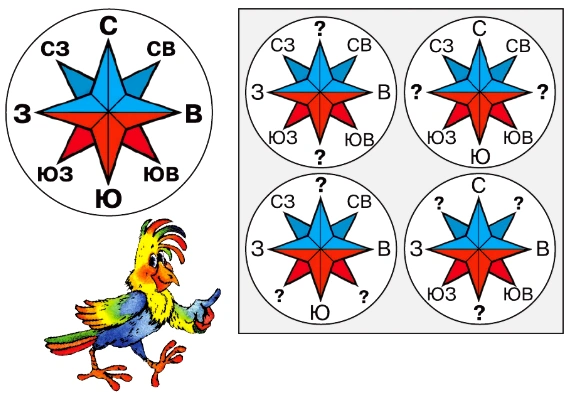 1. Рассмотрите схемы, на которые указывает Попугай. Какие стороны горизонта на них не обозначены?