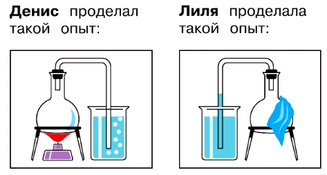 Денис правильно поставил опыт. При нагревании воздух расширяется и начинает по трубке выходить через наполненный водой мерный стакан.
