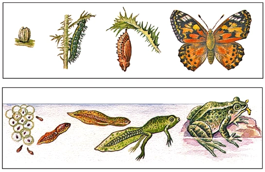 С помощью этих иллюстраций можно узнать о развитии животных. На иллюстрациях изображено развитие бабочки и лягушки.