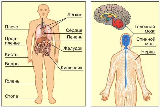 • Нервная система: головной мозг, спиной мозг и нервы. Это органы, которые управляют деятельностью всего организма.