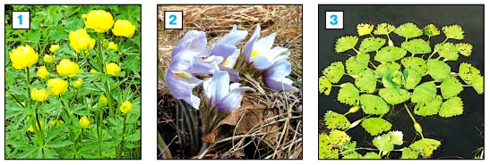 Растения Красной книги России: венерин башмачок, купальница, кувшинка, водяной орех, волчье лыко, ятрышник, сон-трава, подснежник, женьшень и другие.