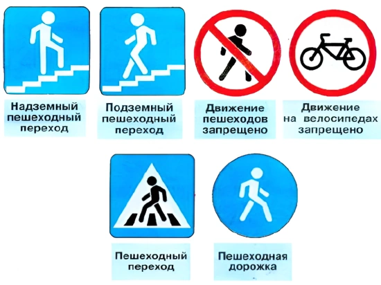 Особенно важно знать пешеходу знаки «Пешеходный переход», «Надземный переход», «Подземный переход», «проход запрещен».