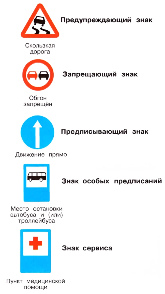 Дорожные знаки делят на группы: предупреждающие, запрещающие, предписывающие, знаки особых предписаний, информационные знаки, знаки сервиса.
