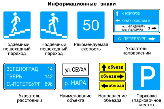 Информационные знаки информируют о расположении населённых пунктов и других объектов, о различных режимах движения.