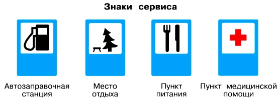 Знаки сервиса подсказывают водителю, где можно поесть и отдохнуть, починить машину, где находится автозаправочная станция, больница и т.д.