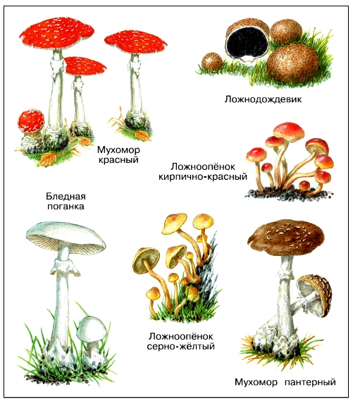 Я знаю ядовитые грибы — мухомор, бледная поганка, белая поганка, ложноопенок, ложнодождевик.