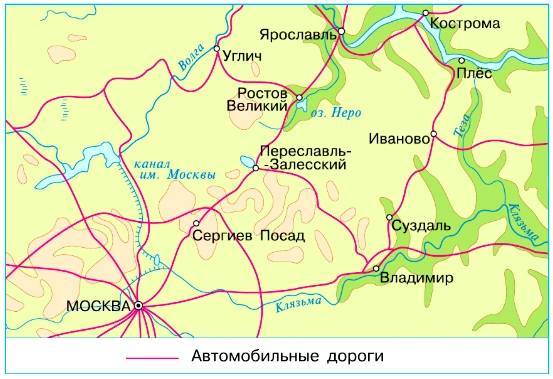 • Рассмотри карту. Проследи по карте маршрут нашего путешествия по Золотому кольцу: Москва – Сергиев Посад – Переславль-Залесский – Ростов Великий – Углич – Ярославль – Кострома – Иваново – Суздаль – Владимир. А еще мы посетим город Плёс, которые не входит в традиционный маршрут Золотого кольца, но очень интересен.